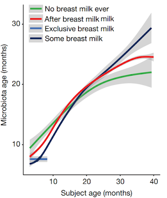為了評估採樣時仍哺乳的嬰兒腸道菌相是否可能有前述的遲緩現象,Stewart et al. 比較哺乳者與未哺乳者的菌群年齡。菌群年齡是從樣本預測的採樣年齡,可用於評估腸道菌發育階段,其有以下幾個假設: